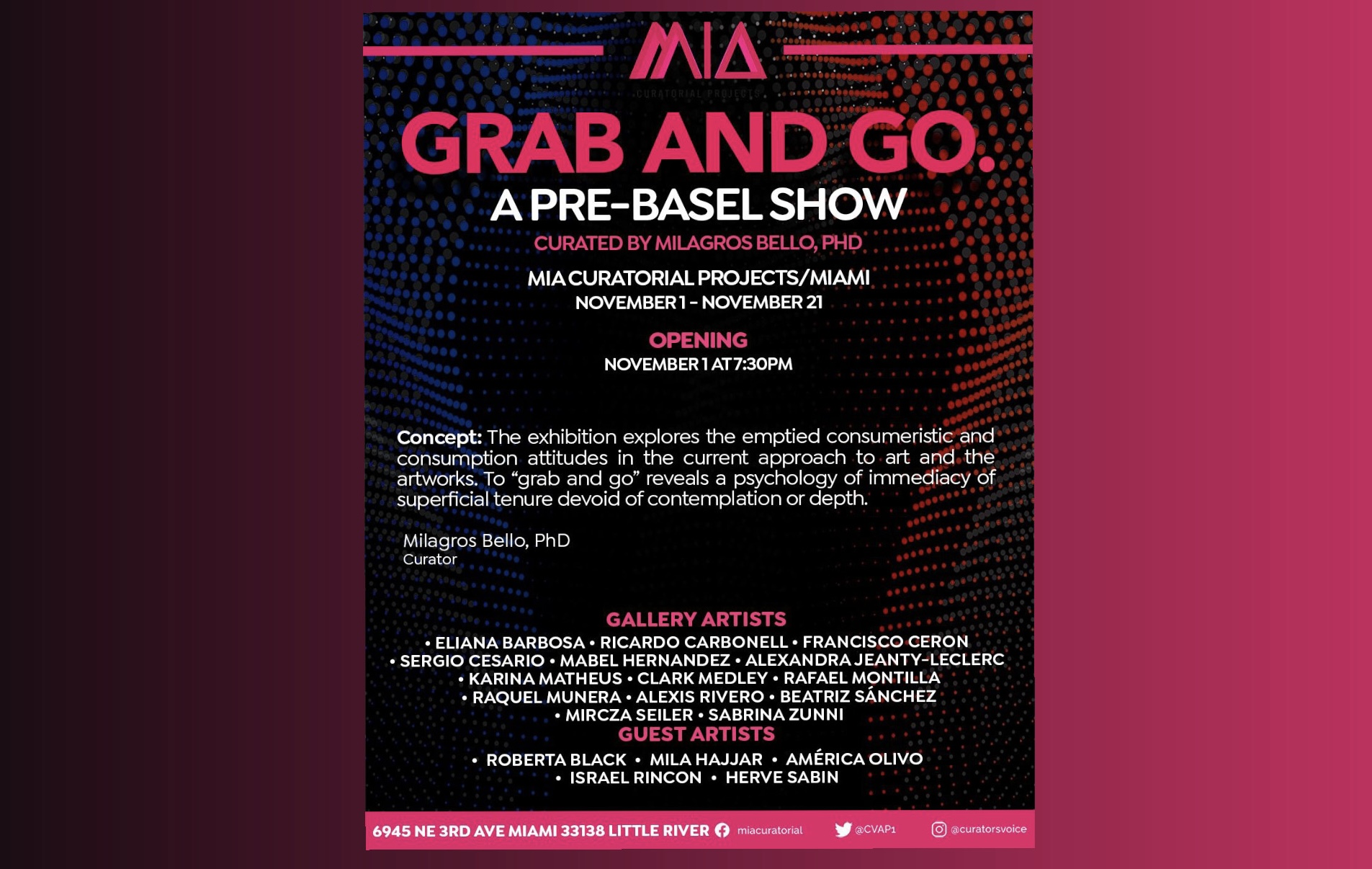 MIAMI, FL, UNITED STATES, October 28, 2025 /EINPresswire.com/ -- As the city begins to pulse with the anticipation of Art Basel Miami Beach, MIA Curatorial Projects announces its final two exhibitions of the year: GRAB AND GO (Pre-Basel Show) and DRIFTS AND TREMORS (Art Basel Season Exhibition). Curated by Dr. Milagros Bello, the programs continue the gallery’s commitment to