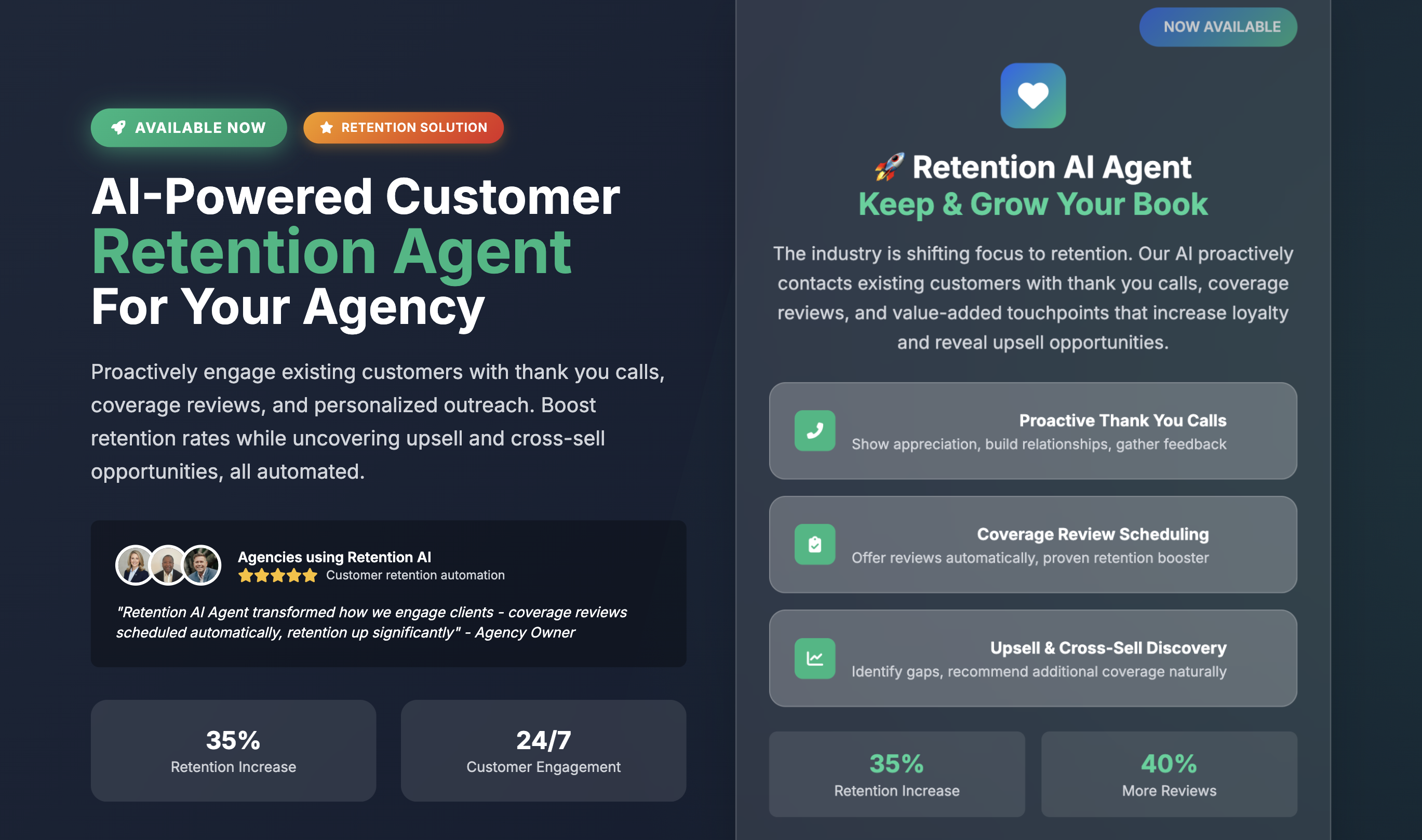 - Automated Coverage Reviews: The AI systematically contacts every client to schedule coverage reviews, a proven retention driver that most agencies simply "don't have time for."